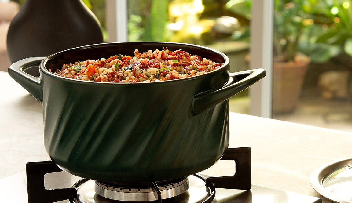 Handcrafted in Brazil from 100% ceramics, this casserole is fully compatible with various stovetops and appliances, including the microwave and oven thanks to its ceramic lid.